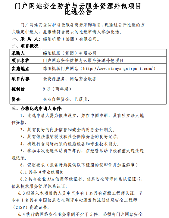 1. 門(mén)戶網(wǎng)站安全防護(hù)與云服務(wù)資源外包項(xiàng)目比選公告