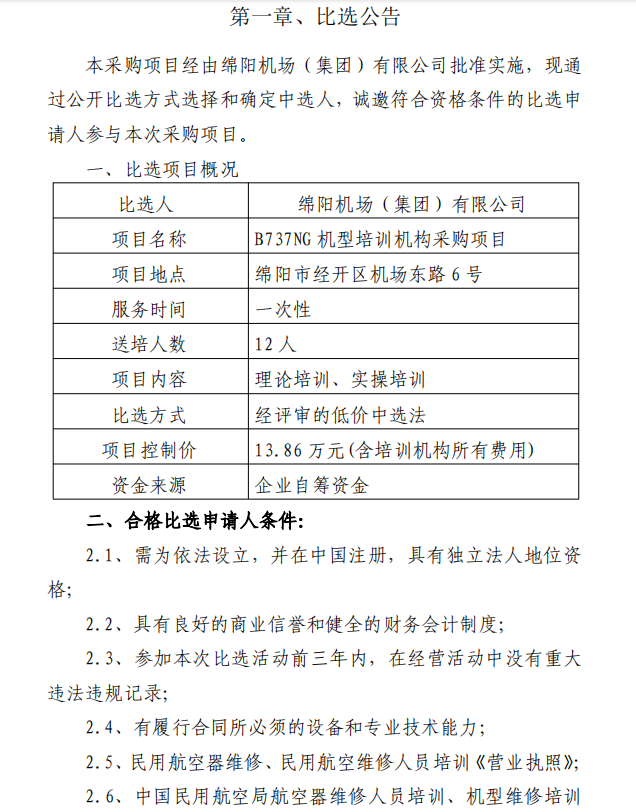 1. 綿陽機(jī)場(chǎng)B737NG機(jī)型培訓(xùn)機(jī)構(gòu)采購項(xiàng)目比選公告