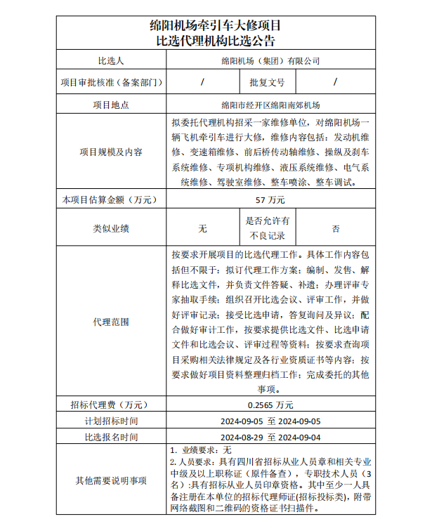 1. 綿陽機場牽引車大修項目比選代理機構(gòu)比選公告