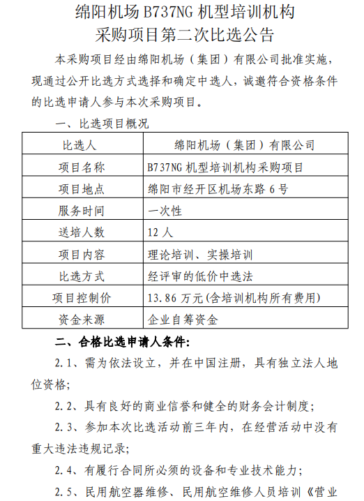 1. 綿陽機(jī)場B737NG機(jī)型培訓(xùn)機(jī)構(gòu)采購項(xiàng)目第二次比選公告